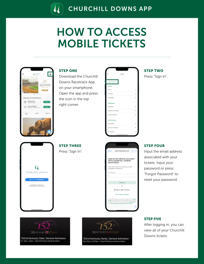 Oaks and Derby Undercard Tickets are in the trainer or trainer designated Churchill Downs Mobile App account with only a few exceptions. A parking guide for KEC and how to access your tickets is attached. On Thursday morning, a few members of the sales team will be on hand at the Stable Suite from 7:00AM – 9:30AM to help navigate the Churchill Downs Mobile app. You can also reach our ticketing team for help by phone at (502) 636-4447 or email ky_derby_ticketing@kyderby.com.