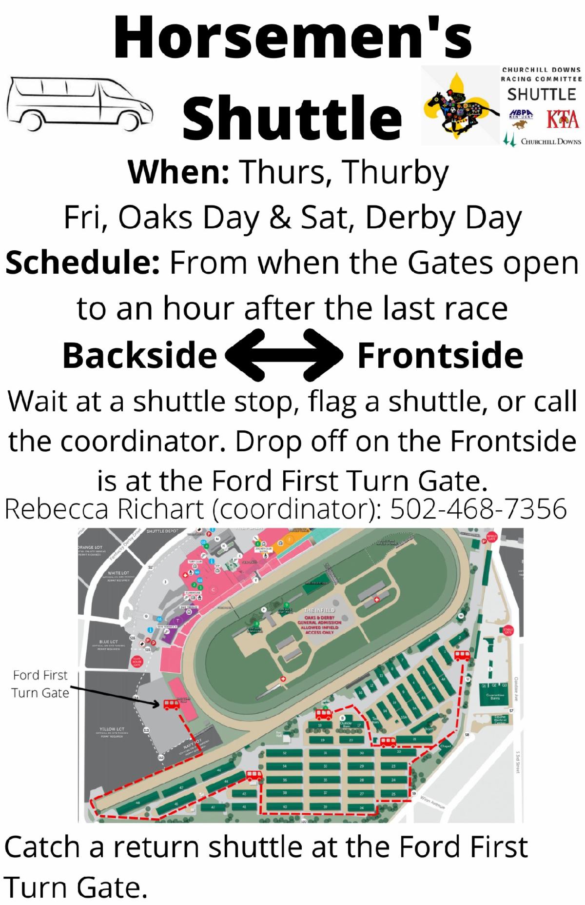 - Horsemen Shuttle will run from the backside to the frontside from gates open 10:30AM – 8:00PM. Shuttle stops on the backside are highlighted in the attached photo and drop off at the Clubhouse Gate.