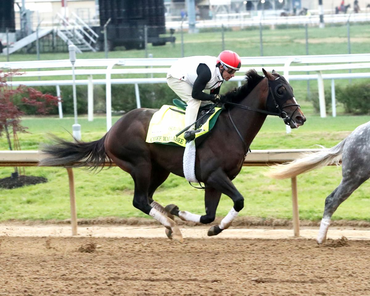 (Coady Media/Renee Torbit photo of Chief Wallabee working April 26 at Churchill Downs with jockey Junior Alvarado aboard)