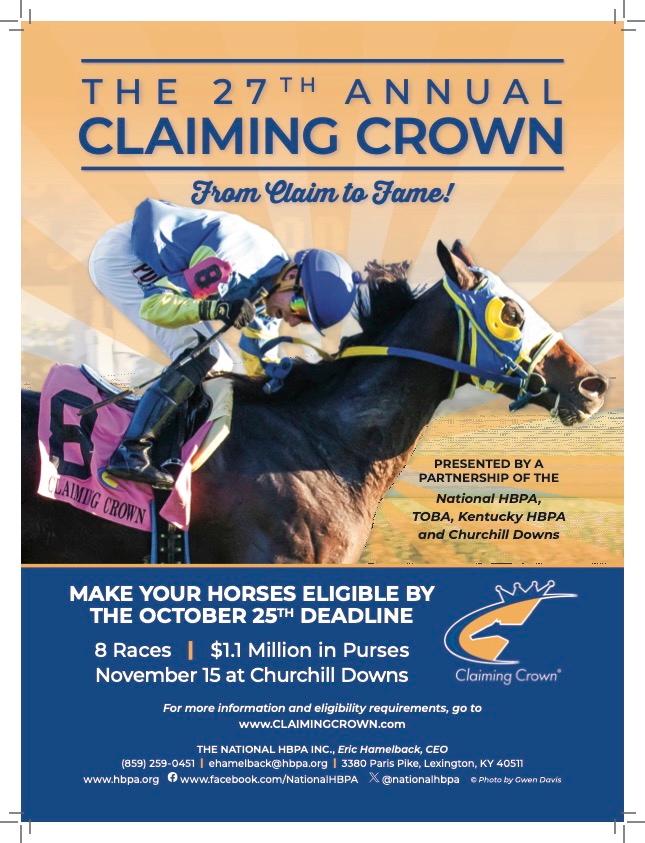 Claiming Crown 2025 is presented by the National HBPA and Thoroughbred Owners and Breeders Association in conjunction with Churchill Downs and the Kentucky HBPA.