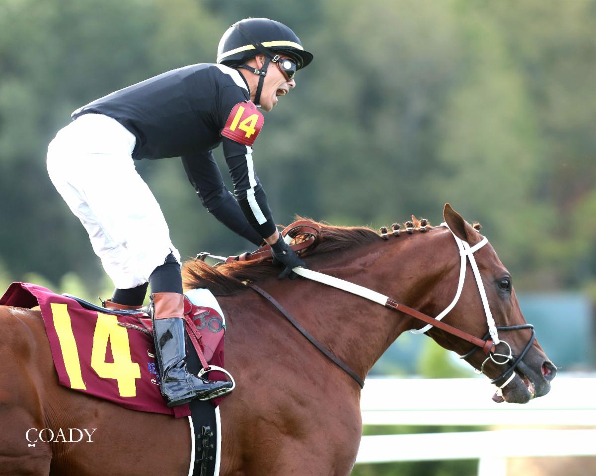 (Jose Ortiz after Lagynos gave him a fourth win on Kentucky Downs’ opening card in the $500,000 Keeneland Sales Tapit Stakes. Coady Media/Renee Torbit)