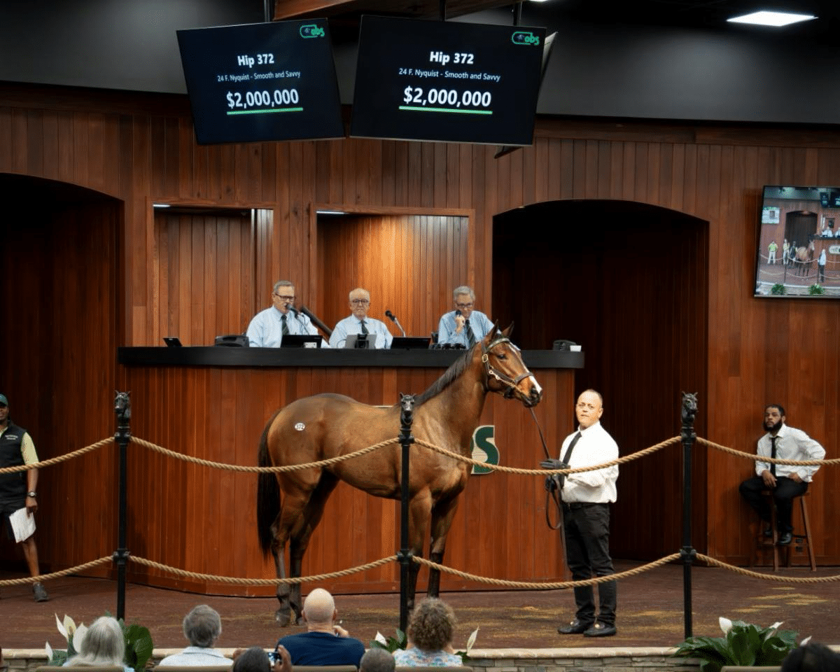On a day that saw three more horses sell for seven-figures, bringing the total to six who have hit that threshold over the first two days, Hip 372, a bay filly by Nyquist consigned by Wavertree Stables, proved most in demand when she sold for $2 million to representatives of Boyd Racing.