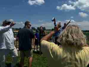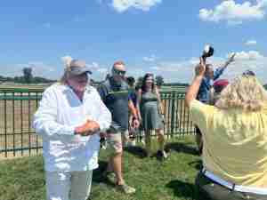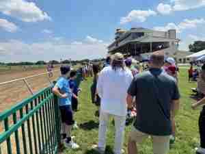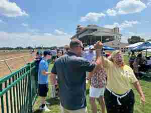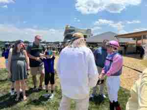 Calmly, I walked over and asked that the four of them could gain access to the paddock and join with our group to celebrate the career debut of our newest horse to race.